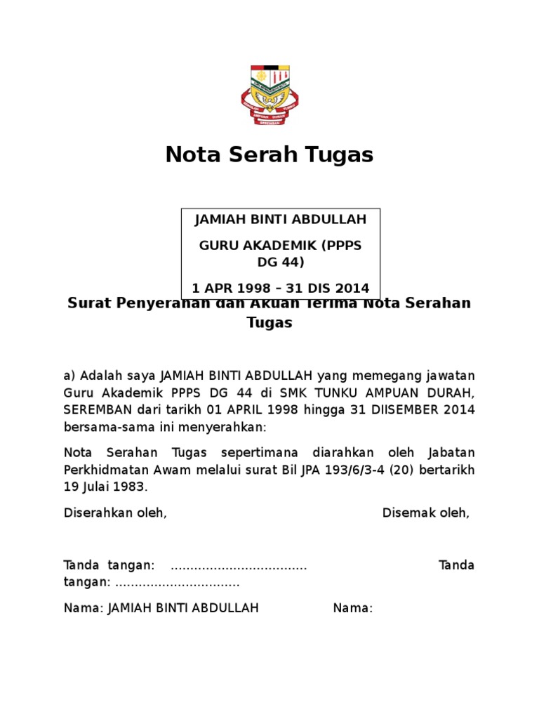 Contoh nota serah tugas guru sekolah rendah surat serahan tugas. Surat rayuan dalam english kecemasan q.