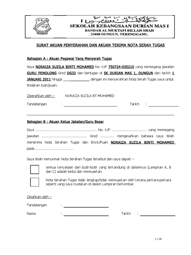 Menjadi pegawai perhubungan di antara pihak sekolah dengan ibu bapa penjaga di dalam masalah disiplin. Surat an serahan tugas emi. Cikgu nurul 27 december 2018 at 14:53. Direktur utama nama perusahaan : Surat serahan tugas nota serah tugas.borang kutipan dan serahan guru ke pejabat darjah.